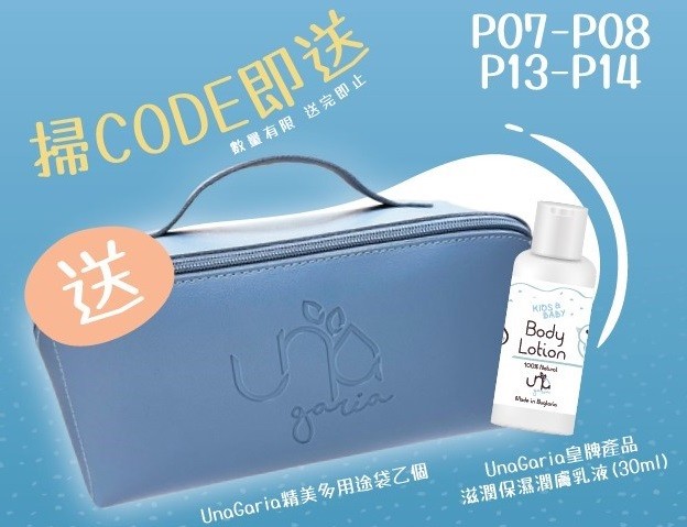憑著優惠券並完成產品登記體驗後可換領贈品UnaGraia全天然嬰兒滋潤保濕潤膚乳液30ml及精美多用途袋乙個,數量有限,送完即止。