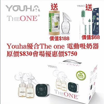 憑著優惠券,可以會場價$750購買優合The One電動吸奶器,並再送Haakaa接奶器加Youha奶樽刷 (總值$256)。每天限20套,售完即止。