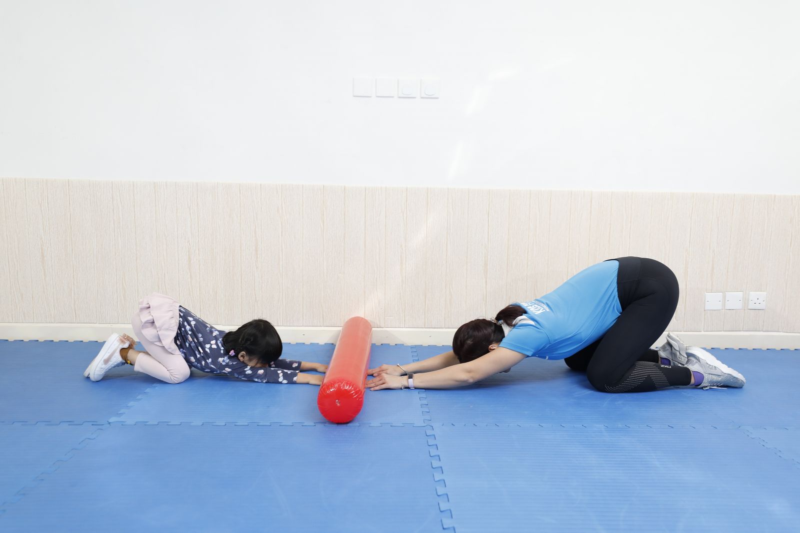 Step1:家長及小朋友面對面屈膝府伏在地上,雙手伸直向前,微微向前爬行,二人中間放空氣棒。之後臀部略為向後坐,維持這姿勢30秒。