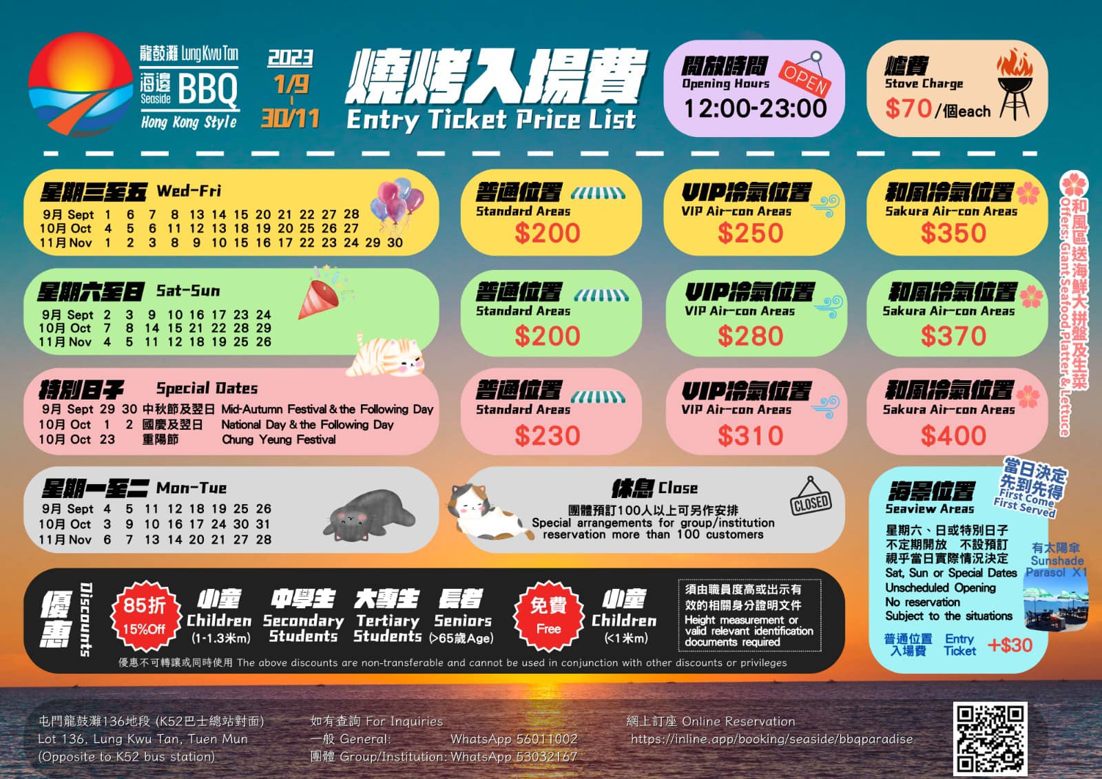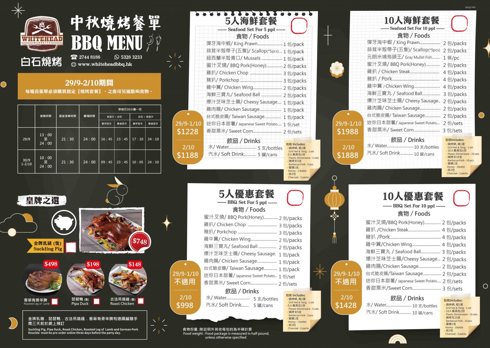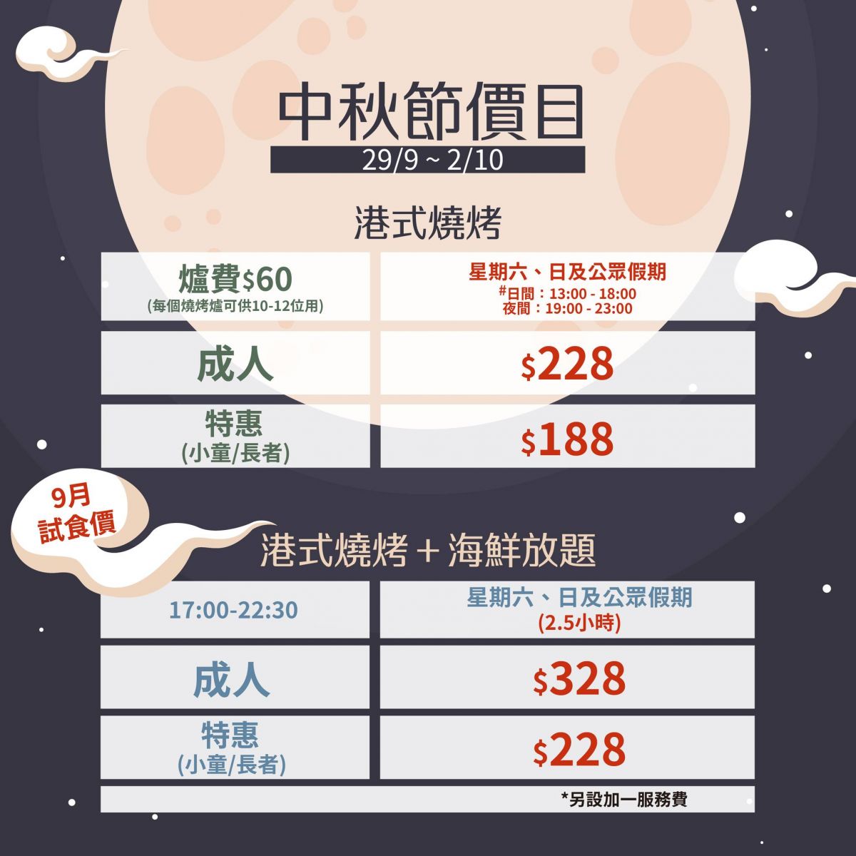 - 中秋節期間(29/9-2/10):成人$228,小童/長者$188,加$30可燒足全日