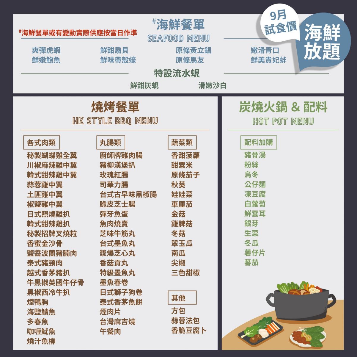 - 海鮮燒烤餐:$1020/ 4-5人,$1630/ 8-9人