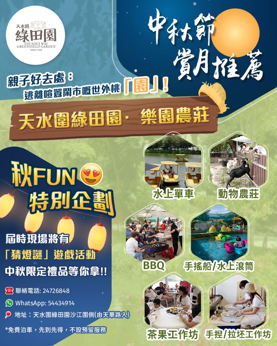 為慶祝中秋節,綠田園開展中秋特別活動「猜燈謎」遊戲,獎品設有中秋限定禮物!BBQ開爐後不限時限,更可免費參觀動物農莊、靈龜池、12生肖石像,還有自費娛樂設施如水上單車、親子恐龍車、膠畫、撈金魚等。
