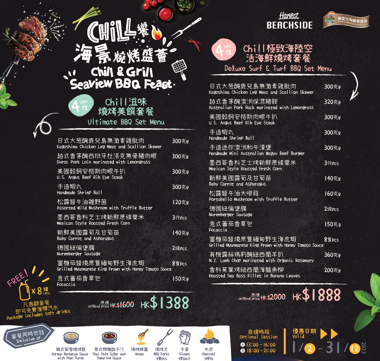 坐落於馬灣沙灘旁的全新戶外濱海餐廳Harvest Beachside,可觀望180度全海景,同時飽覽青馬大橋的日夜醉人美景。餐廳設兩款燒烤套餐,用餐時間3小時,提供多款高質肉類、海鮮配大廚精心調味的特色醬汁。