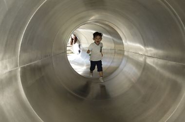 公園內地標之一,就是這個舖上人造草披的半圓型山窿管道,熙熙一見到馬上心花怒放,跑過去率先試玩。他經過長長的管道跑到另一端,跟媽媽一起玩捉迷藏。