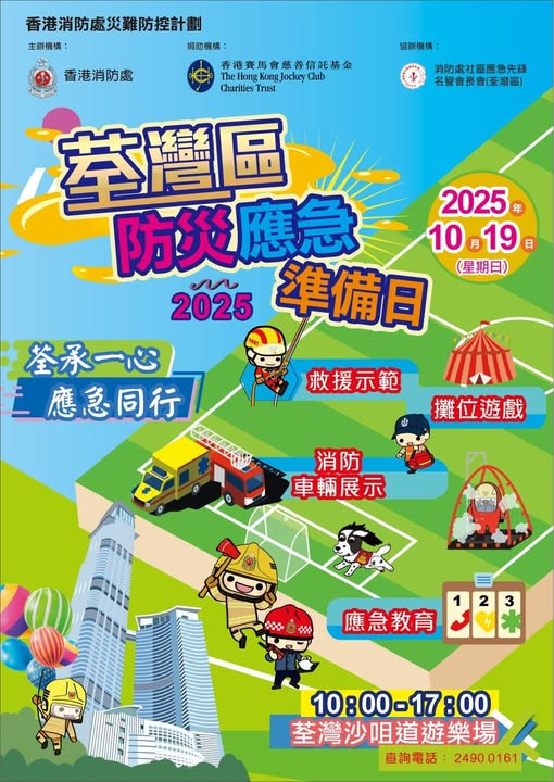 消防處聯同社區應急先鋒名譽會長會(荃灣區)將於10月19日舉行荃灣區防災應急準備日,並響應中華人民共和國成立七十六周年及第十五屆全國運動會,加入國慶和全運會元素,有救護演練和遊戲提升大家防災應急能力,更有機會和消防犬接觸,還有小朋友最喜歡的充氣彈床,等待大家到場。