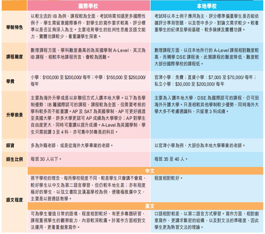 相比本地學制,家長認為國際學校更為適合孩子;而在功課方面,國際學校於低年級相對較少,相對會有較大彈性及空間。