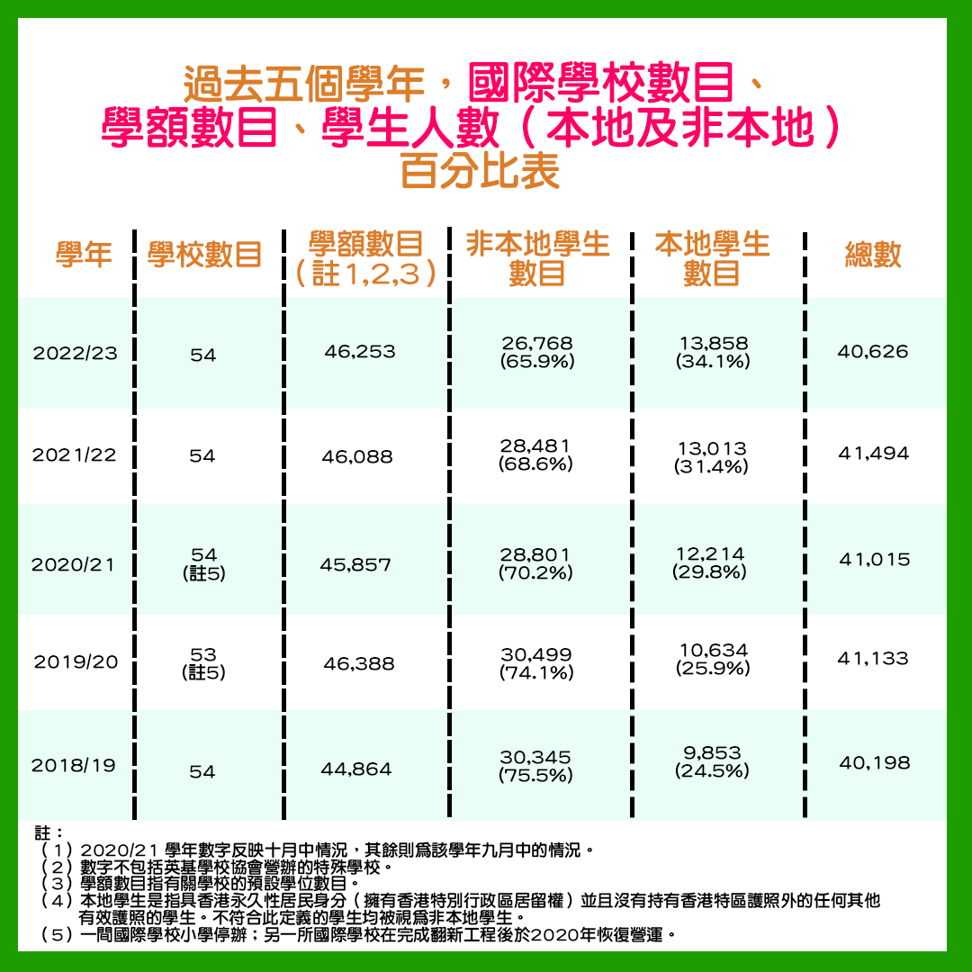 隨移民潮有大量家庭離開香港,令本地學校掀起退學風氣,惟國際學校本地生收生數字竟連年上升至34.1%。此外,非本地學生的收生數字則累計下跌10%。