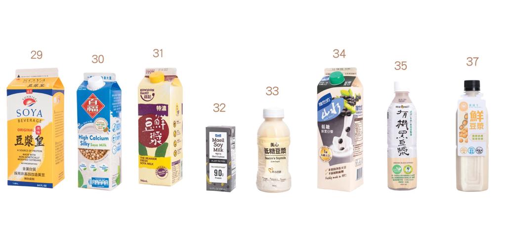 以每100千卡計算,6款豆奶達高蛋白質食物的定義,分別為「Kikkoman」(#28)、「Maeil」(#32)、「維他奶」(#34)、「統洋」(#35)、「豆腐主義」(#38)和「壹品」(#39),該等樣本每100千卡含6.28克至9.01克蛋白質,其每100毫升的含量則為2.21克至4.92克。