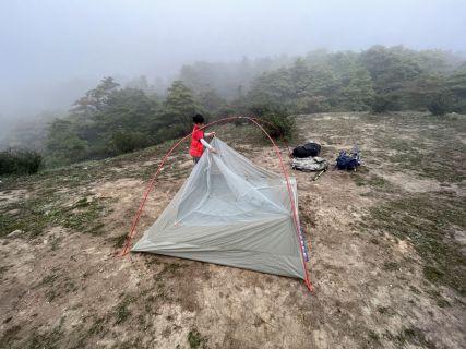 父子二人前往了香港最高點——大帽山。他們上山沿路一直找扎營地,結果到了山頂才找到比較平攤的地方。Jason萬沒想到,凌晨3點多的時候,野豬聞到味道出來覓食,更有好幾隻野豬圍着他們的帳篷開始撕咬。「我馬上叫醒知行,在野豬在帳幕上撕爛的那個口鑽了出去。外面正在下雨,我們剛離開帳幕,它就被吹倒了。」凌晨的大帽山伸手不見五指,父子兩人於黑暗中摸索着往大馬路的方向,聽到有人聲便大叫,「可是人們聽不到!」花費了一些時間,父子二人才找到了路。Jason坦言,望着帳幕被咬爛,他當時很擔心這趟旅程是否只能到此為止了。他忽然想起大帽山近元朗,而他有住元朗的朋友,可以向他借帳幕繼續旅程。柳暗花明又一村,Jason隨即又振奮起來,「原來不一定要放棄!」