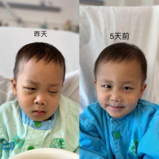 - 同時腫瘤的位置,使他的五官和面型也扭曲了,持續地眼皮紅腫、浣熊眼、流眼水、鼻血、面部腫痛,甚至上下顎牙齒也鬆脫和發炎。