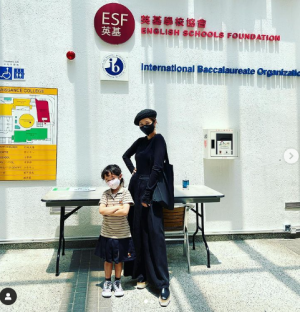 日前Kay就以一身型格黑衫打扮送女兒上學。Karina雖然只是小一生,