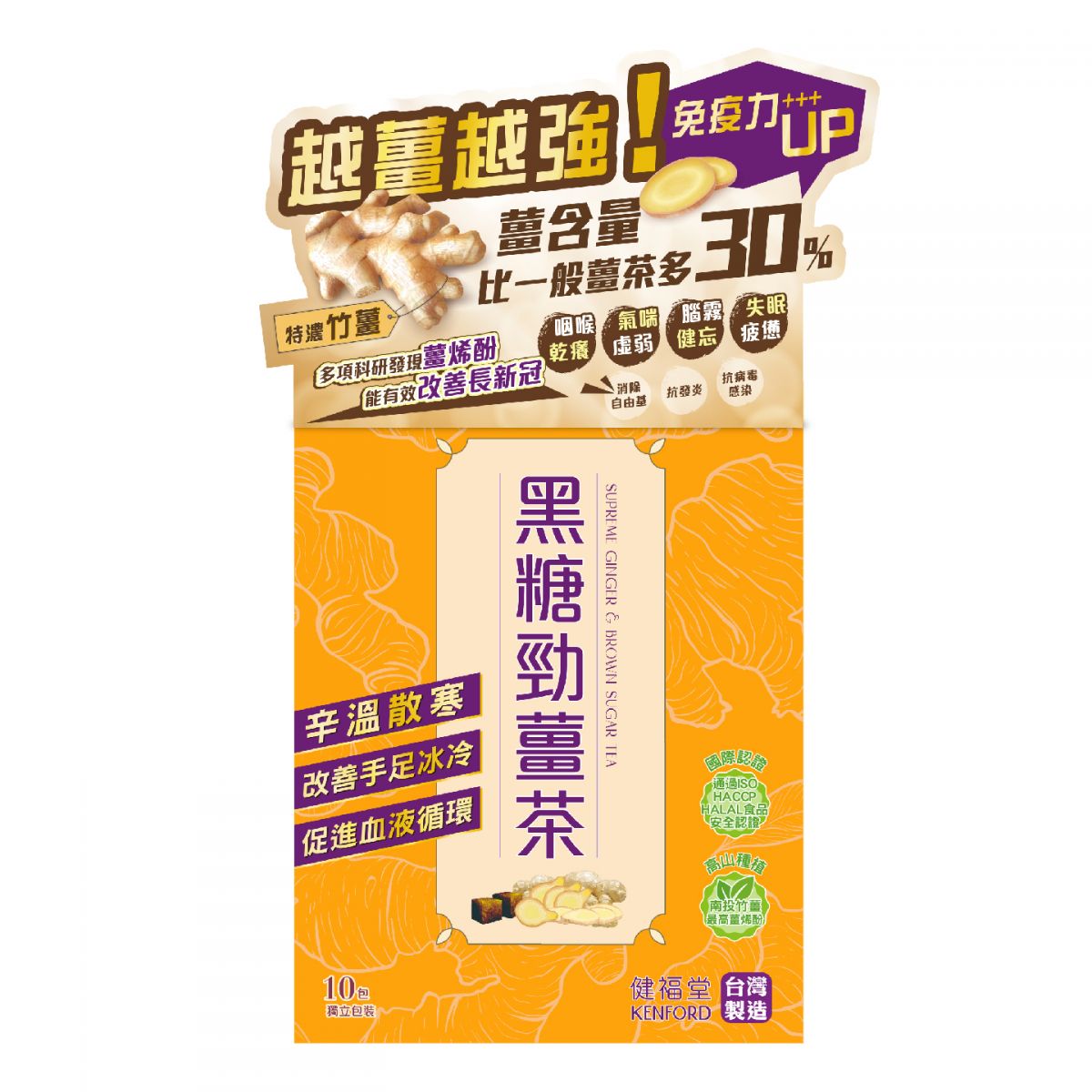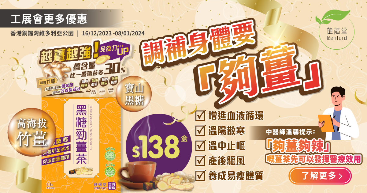 現今愈來愈多人追求健康生活,避免飲用有糖分的飲品。不過,中醫認為「甘入脾」,所以適量的優質糖分對脾胃有益。由健福堂註冊中醫師調配的黑糖勁薑,嚴選珍品竹薑,使用低甜度黑糖。薑茶中的黑糖性温味甘,具有補中益氣、健脾暖胃、對寒性疼痛亦有活血散寒的效用。加上,黑糖勁薑蘊含充分薑辣素及薑烯酚,科研顯示能有效抗發炎,預防抗病毒感染及增強免疫力。