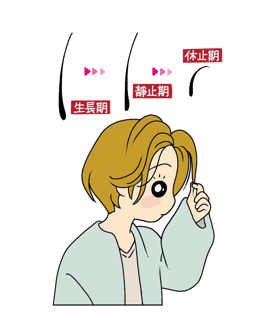 正常人體的頭髮有生長期、衰退期跟休止期3個階段的周期,頭髮到生長期的尾聲便會準備進入衰退期,停止細胞分裂生長。毛球萎縮並準備進入休止期的階段,也就是平時輕輕梳頭髮都會脫落,當休止期結束便會開始冒出細髮,進入下一個生長期的階段。