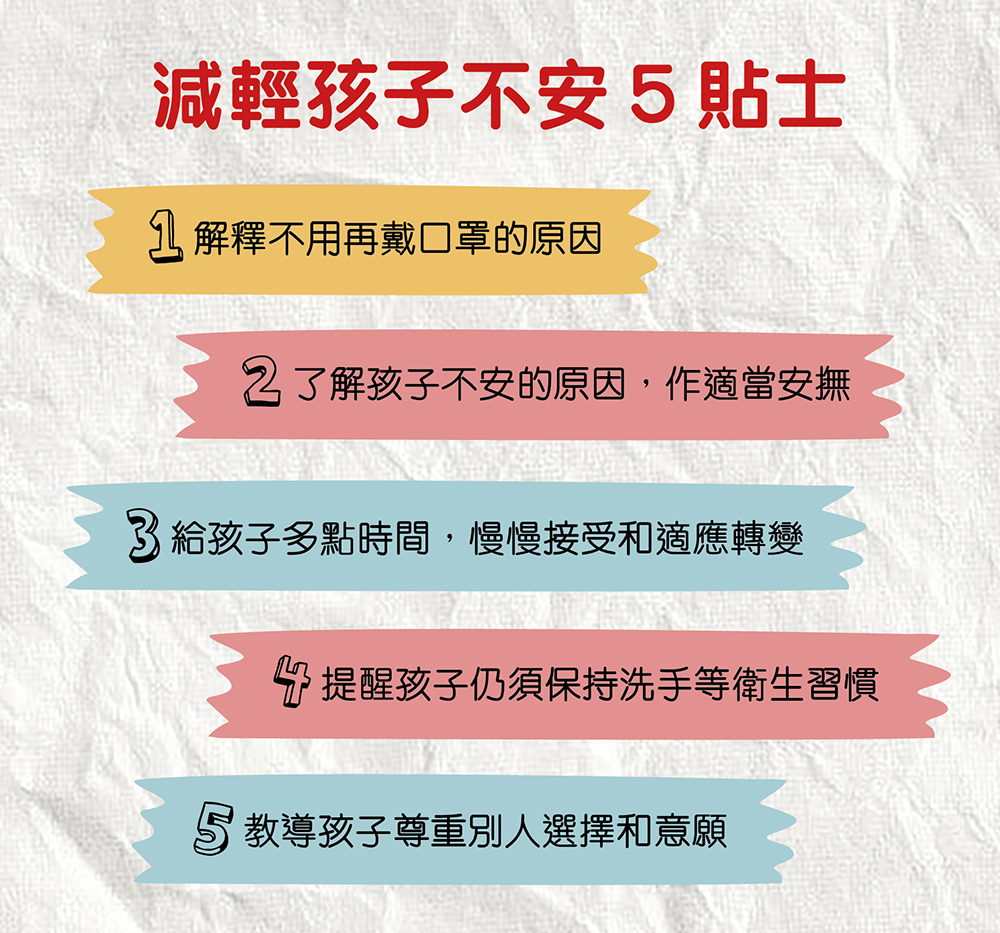 不過,葉妙妍也提醒家長要提醒小朋友應注重個人衞生習慣,亦要教導他們無論對方是否戴口罩,也應尊重對方的意願,讓小朋友慢慢接受和適應轉變。