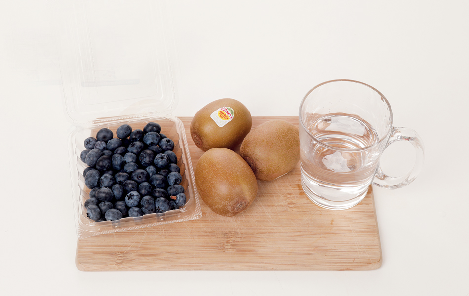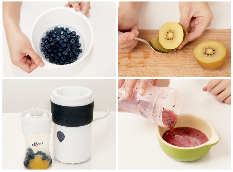 3. 把藍莓、半個奇異果及適量清水放入攪拌機,攪拌至蓉狀。