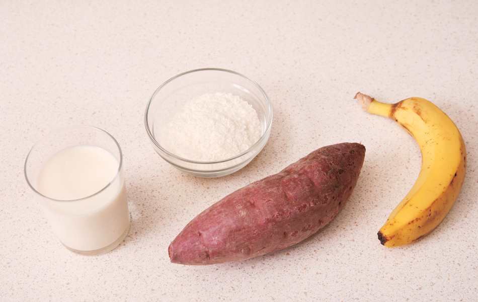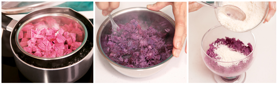 4. 將甜薯壓成蓉,加入奶拌勻,備用。