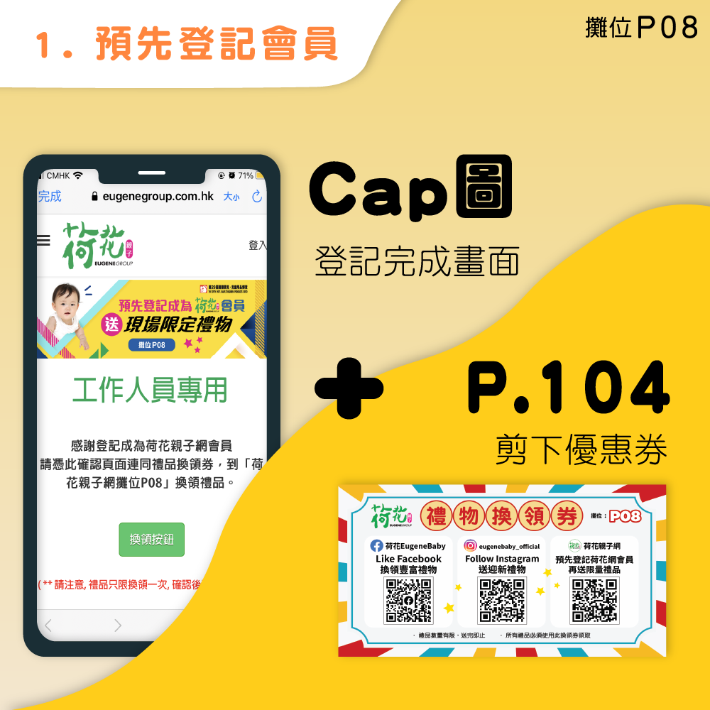 3. 出示換領劵(P.104),出示登記完成之cap圖,可獲迎新禮物