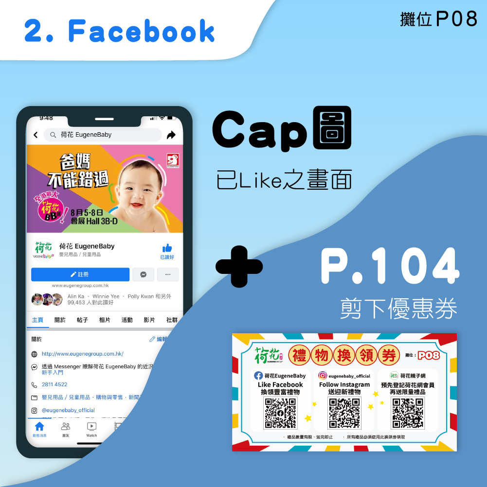 3. 出示換領劵(P.104),出示Facebook已讚好畫面,可獲迎新禮物