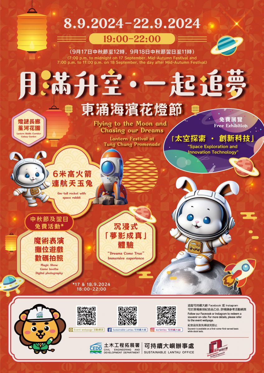 土木工程拓展署今年舉辦的東涌海濱花燈節以奇妙太空探索之旅為主題,有6米高火箭連航天玉兔在中央入口迎接大家,長廊掛滿了由數百位小朋友親手製作的特色花燈,大家更可以進入12米闊的沉浸式「夢影成真」空間,體驗在太空般的中秋影像漫遊。