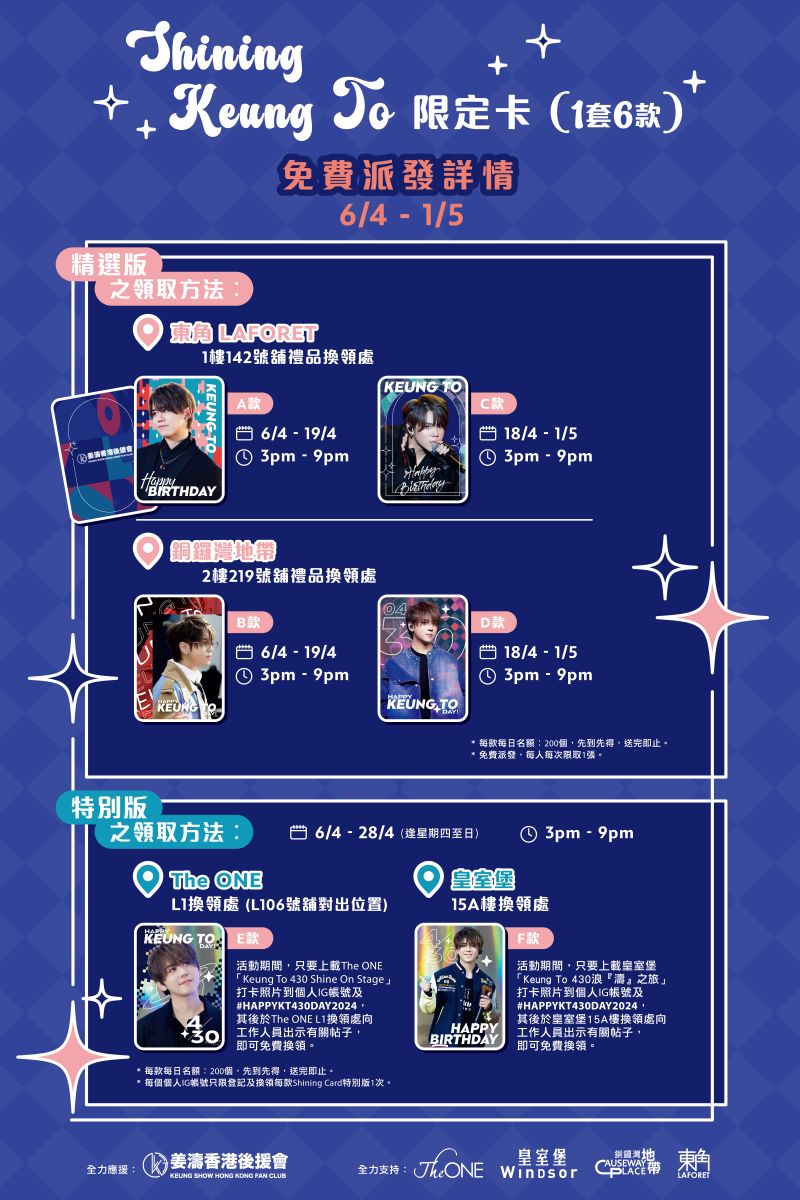 The ONE、皇室堡、銅鑼灣地帶及東角LAFORET特別由即日起至5月1日期間,於指定時間派發1套6款的「Shining Keung To 限定卡」,當中包含2款限定特別版款式及4款精選版卡款,每日名額有限。