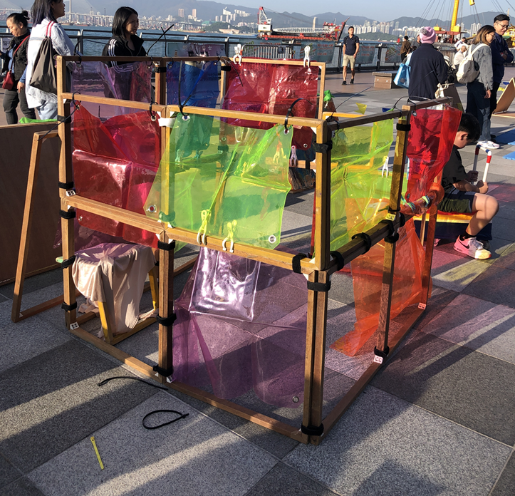 「想像搭建區」設有多元化素材,小朋友可四處蒐集色彩繽紛的素材自由組裝,發揮想像創造獨有的「歡樂王國」。