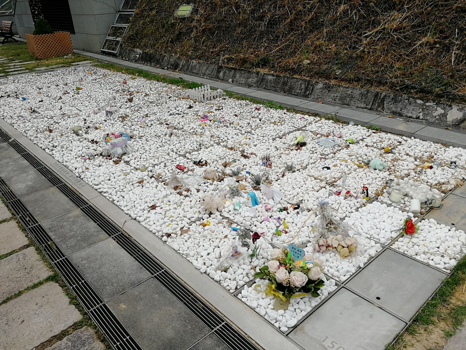 謝美兒表示,「因為一首聞一多的詩,我們特地選擇在墓園栽種松樹。」聞一多為悼念亡女而作的詩歌《也許》中寫到「撐一傘松蔭庇護你睡」,因此松樹也無聲傳達了父母對逝去寶寶的思念和守護。「永愛園」提供了300個位置,下葬時,爸媽將胎兒放進一個可分解的紙盒當中,然後埋入土裏,隨着時間推移,胎兒再次回歸塵土。每個位置會鋪上石頭,筆者亦見上面擺有鮮花和各式可愛的玩具,彷彿這些寶寶從未離開。