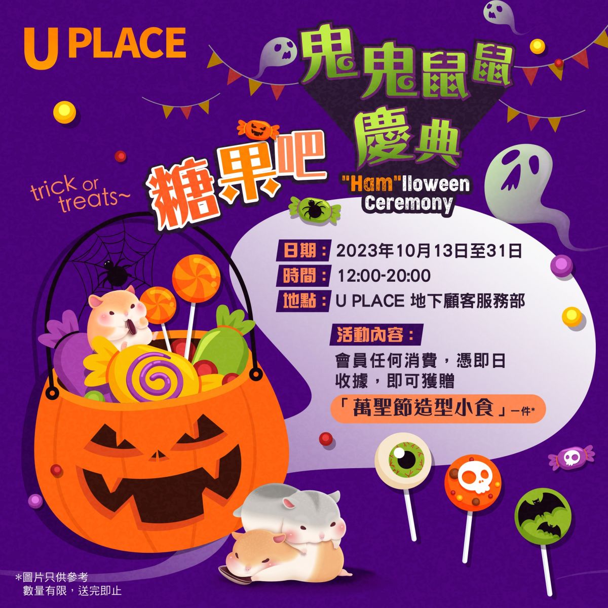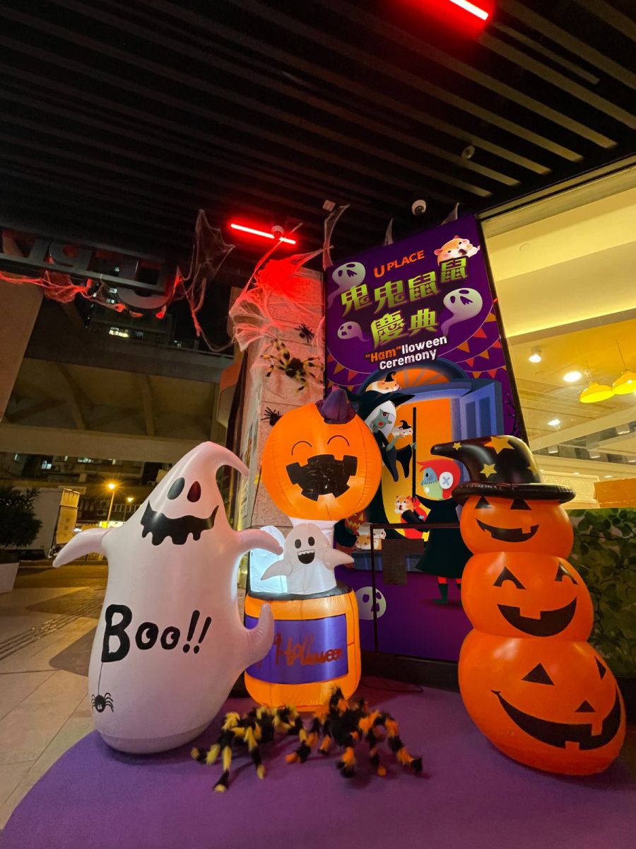U PLACE誠邀大家打扮裝身,由嘩鬼團長帶大家夜遊「鬼鬼鼠鼠慶典」,多個打卡位等待大家和小毛孩。慶典前後門都有鮮艷血紅色嘅U PLACE燈箱照住,並帶你走進怪異空間,還有大小蜘蛛及中庭的嘩鬼和「盞鬼」大南瓜等裝飾。開心打卡後,小朋友砧砧去「糖果吧」拿萬聖節小食,完滿渡過一個驚喜重重的晚上!