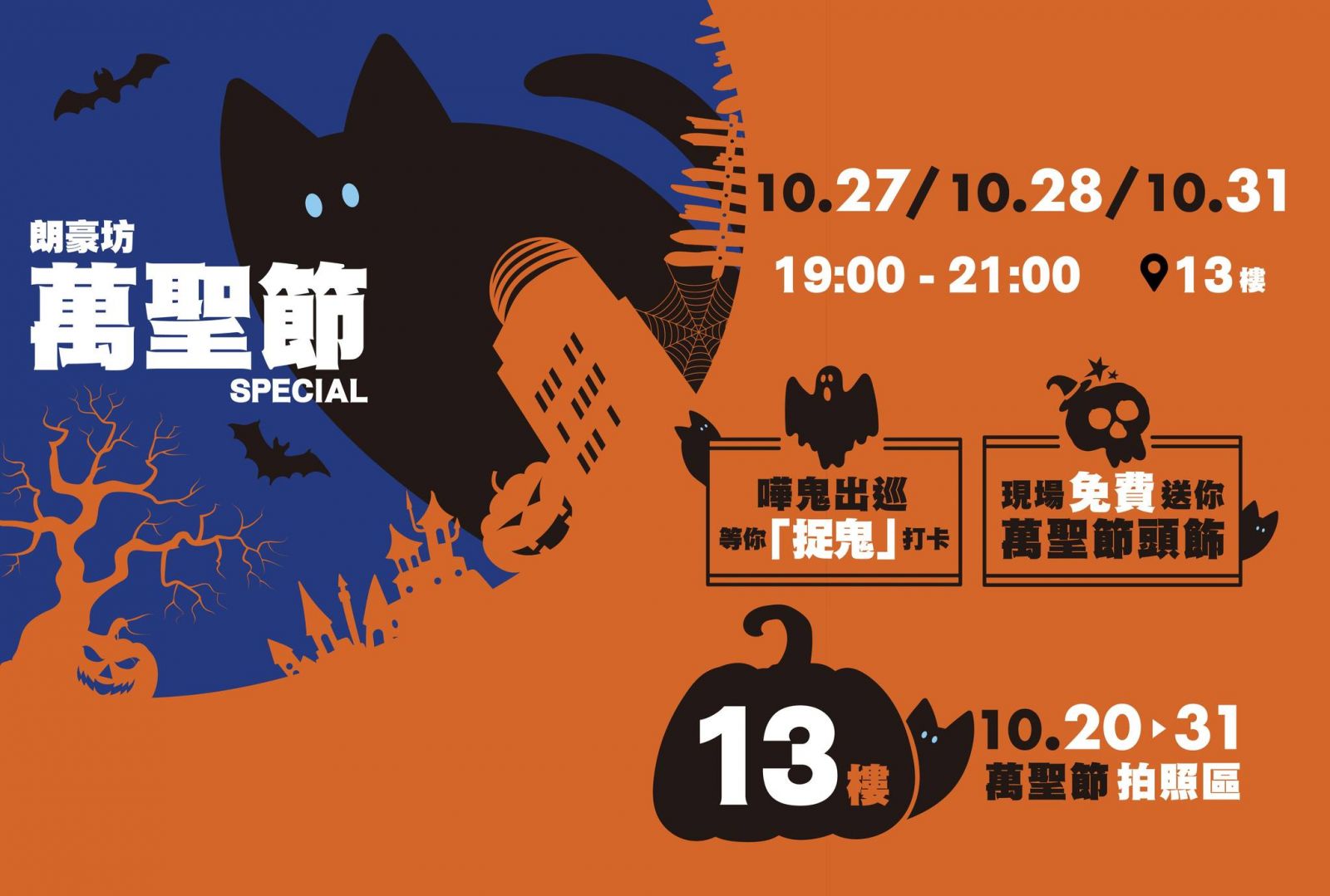 朗豪坊將於13樓佈置成萬聖節派對的場地,萬聖節版南瓜、小蝙蝠及小夜貓圍著巨型發光月。此外,在10月27日、28日及31日,嘩鬼們更會現身出巡,並大派萬聖節頭飾 ,等大家一起「捉鬼」打卡、狂歡!