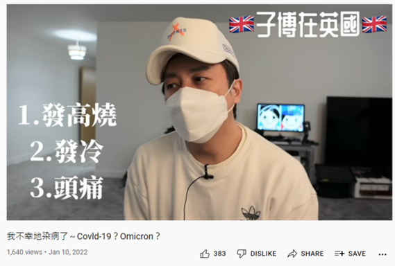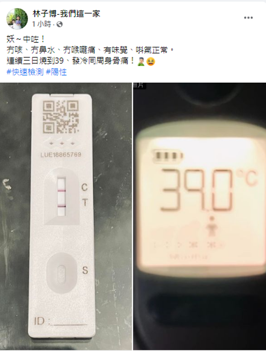 今早10/1則分享自己快速測驗結果照片指子博指自己:「冇咳、冇鼻水、冇喉嚨痛、有味覺、唞氣正常。連續三日燒到39、發冷同周身骨痛!」子女暫未有染疫。希望子博早日康復,平安順利。