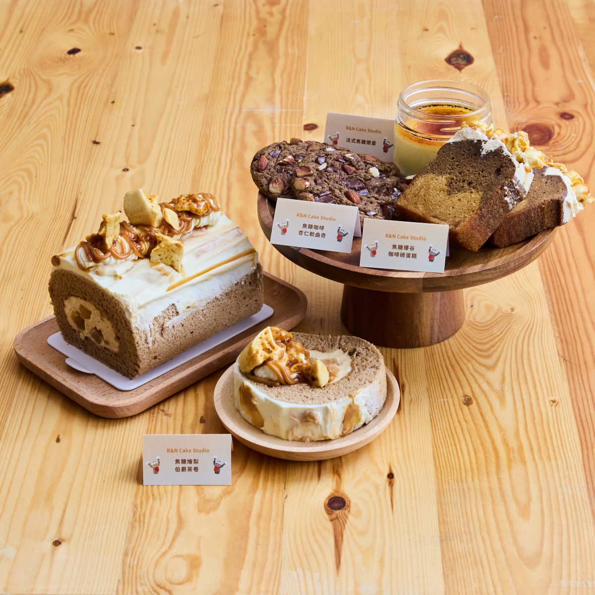 R&N Cake Studio主打精緻、用料上乘的生日蛋糕、卷蛋及其他烘焙食品。他們為是次市集設計了三款精巧而吸睛的西式甜點。焦糖燴梨伯爵茶卷採用焦糖忌廉、頂層抹上焦糖醬和焦糖脆脆,帶出多重焦糖風味和口感,內餡用上焦糖燴梨粒和鬆軟的香蕉伯爵茶戚風蛋糕,呈現豐富的味覺體驗。焦糖爆谷咖啡磅蛋糕以焦糖的微焦甜味碰撞濃郁咖啡香,磅蛋糕口感綿密,配上香脆焦糖爆谷,叫人欲罷不能。法式焦糖燉蛋香濃軟滑,加入馬達加斯加雲呢拿籽,及鋪上一層焦糖面,味道更見層次。