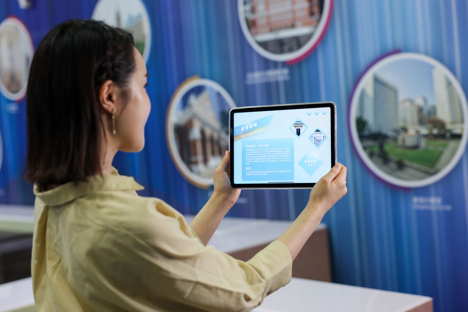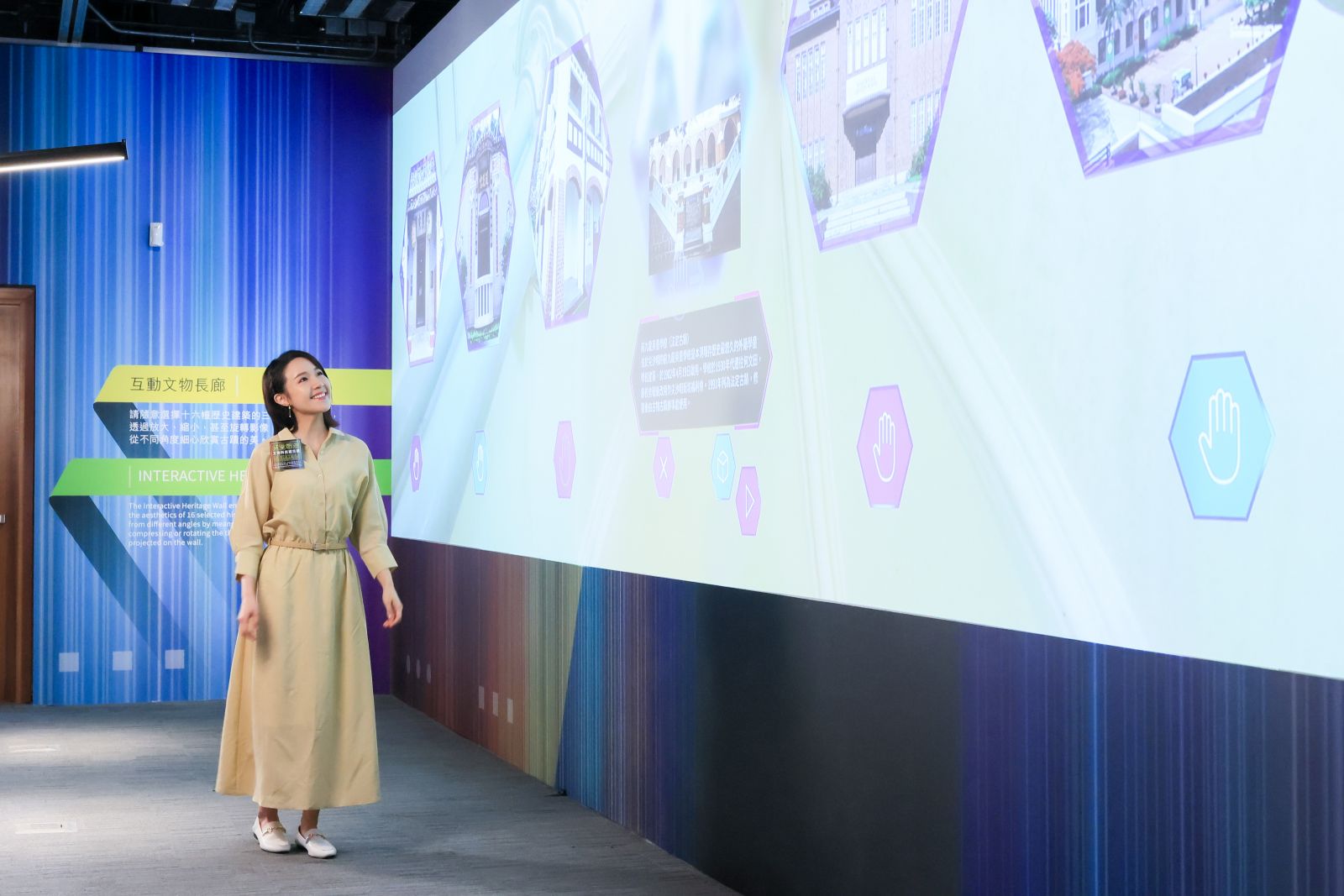 「互動文物長廊」展出多達16幢歷史建築,當中包括葉定仕故居、馬場先難友紀念碑、廈村鄧氏宗祠、香港大學大學堂、鴨脷洲洪聖古廟等,參觀者於長廊選擇欲詳細了解的建築物,然後選擇語言,眼前便會出現該建築的簡介及相關三維影像及影片。大家只要在畫面前以手指揮,便能夠將三維影像放大及縮小,甚至360度旋轉影像,零距離了解多個歷史建築的特色,趣味暢遊歷史建築!