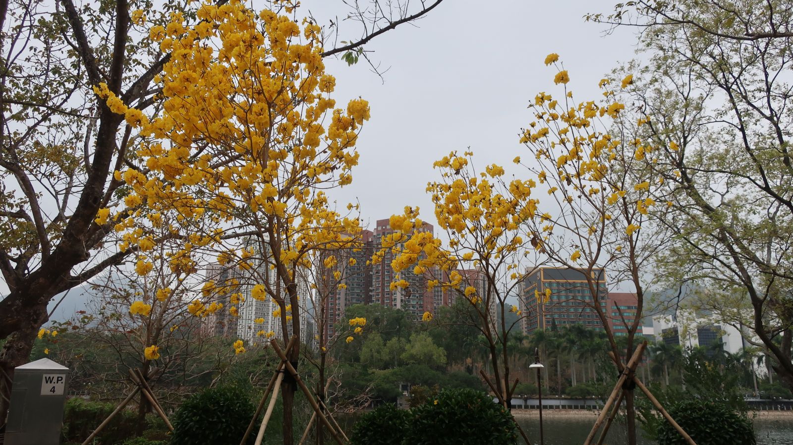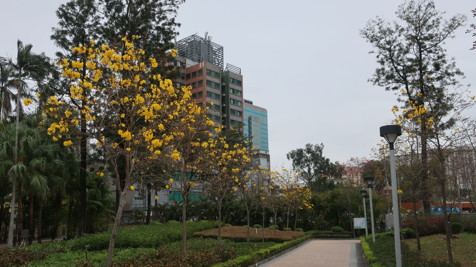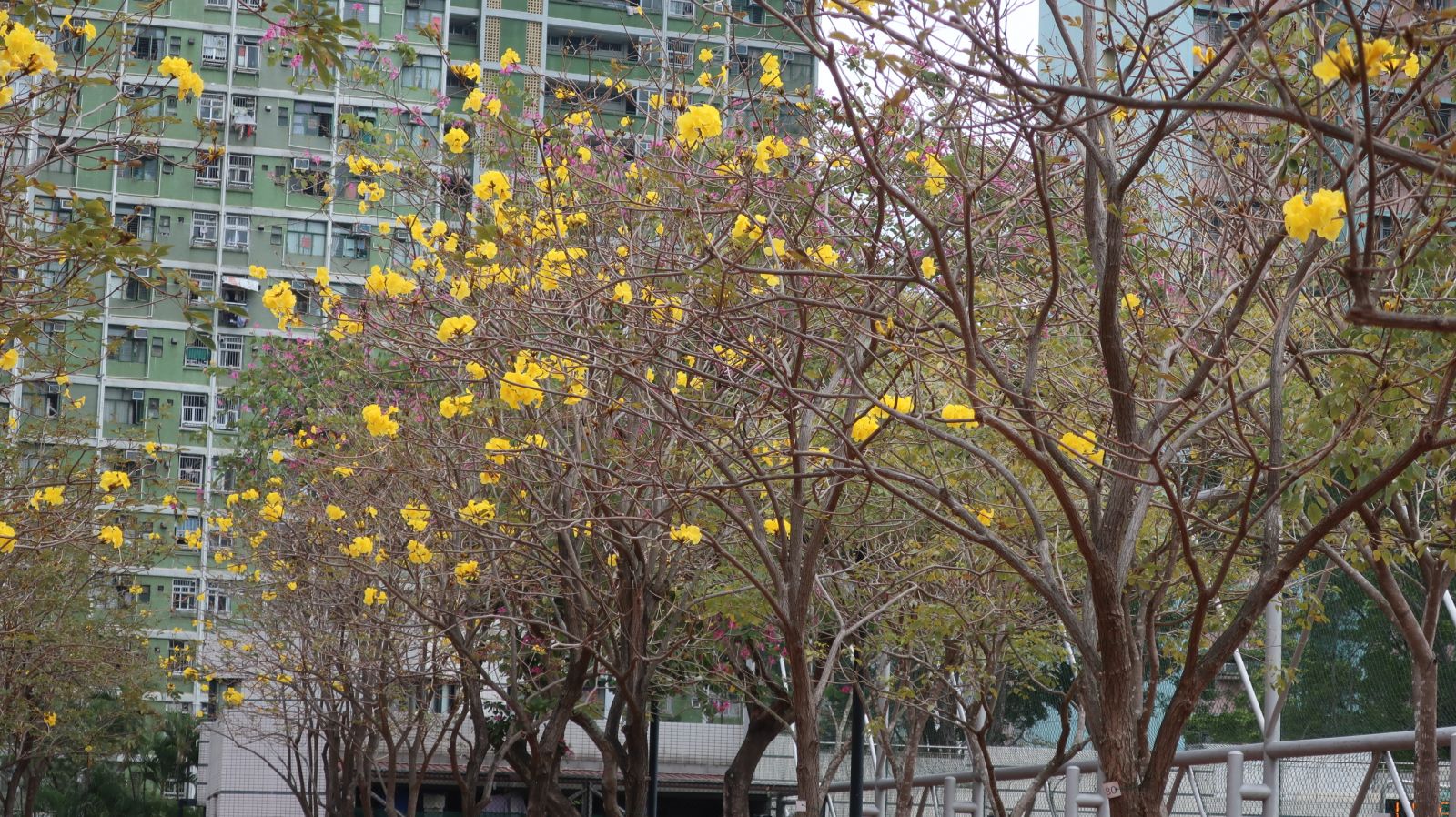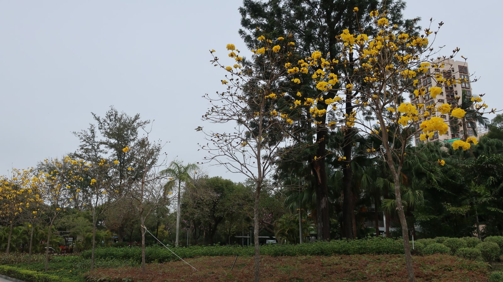 園內共種了約20棵黃鐘木。綻放時,金黃花海吸引了不少市民觀賞並拍照。