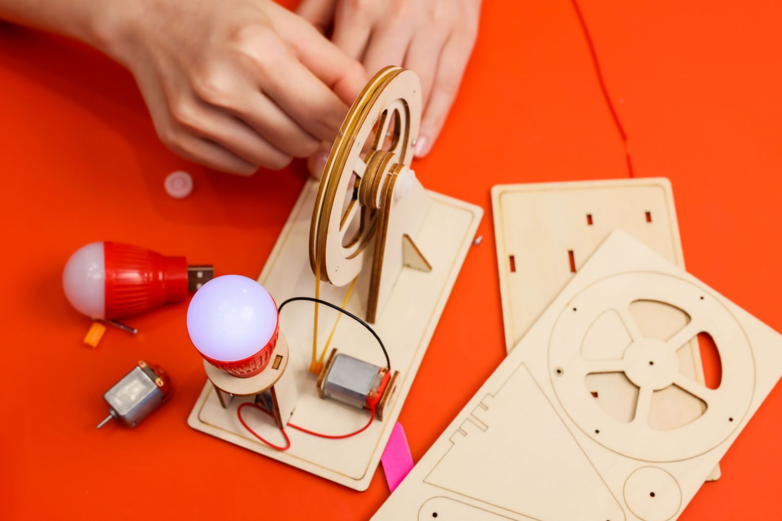 小朋友可以學怎樣砌出手動發電機,從中了解發電原理,點亮燈泡。