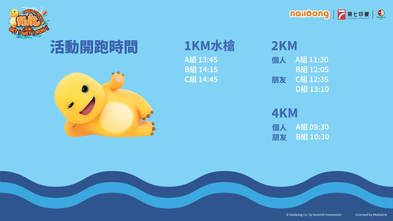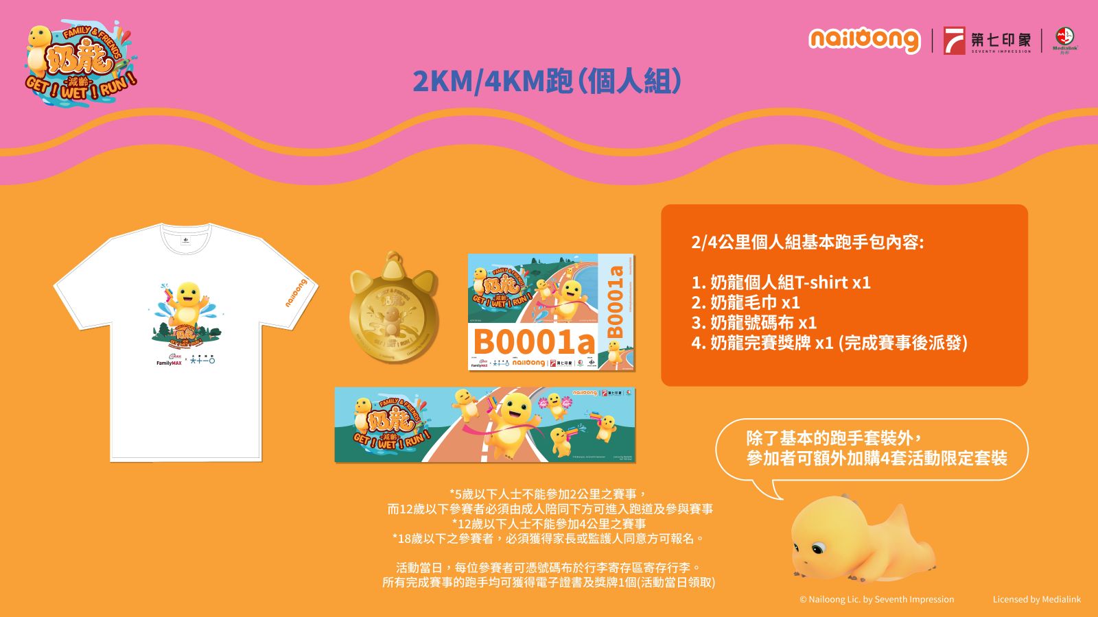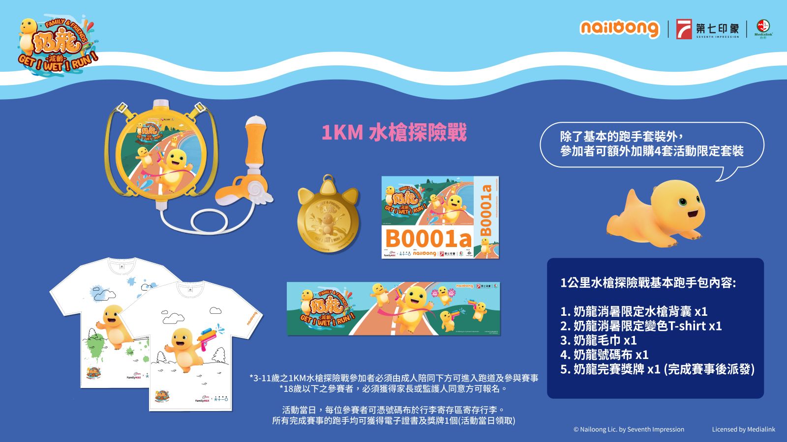 活動設有1公里、2公里及4公里3項賽事,大家可挑戰個人賽,亦可邀請家人朋友組隊比賽。參與1公里賽事的跑手更可以挑戰全港首個加入水槍元素的路跑,與奶龍一齊化身「神槍手」。