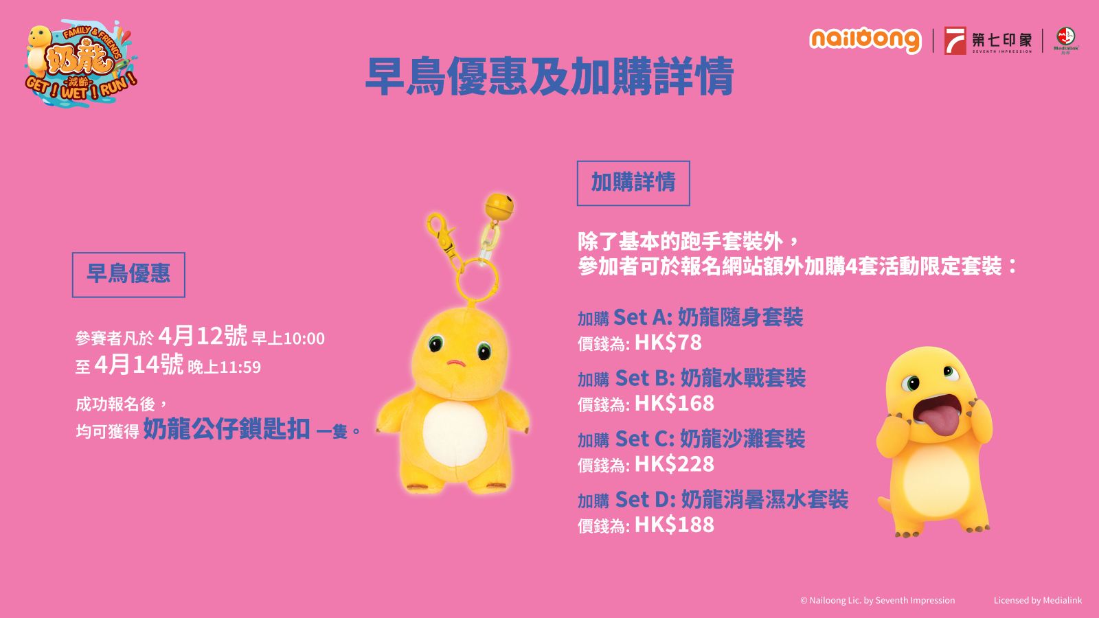 活動門票將由4月12日開始於網上預售,參賽者凡於4月12日10am至4月14日11:59pm成功報名後,可享早鳥優惠,獲得「奶龍公仔鎖匙扣」1隻。