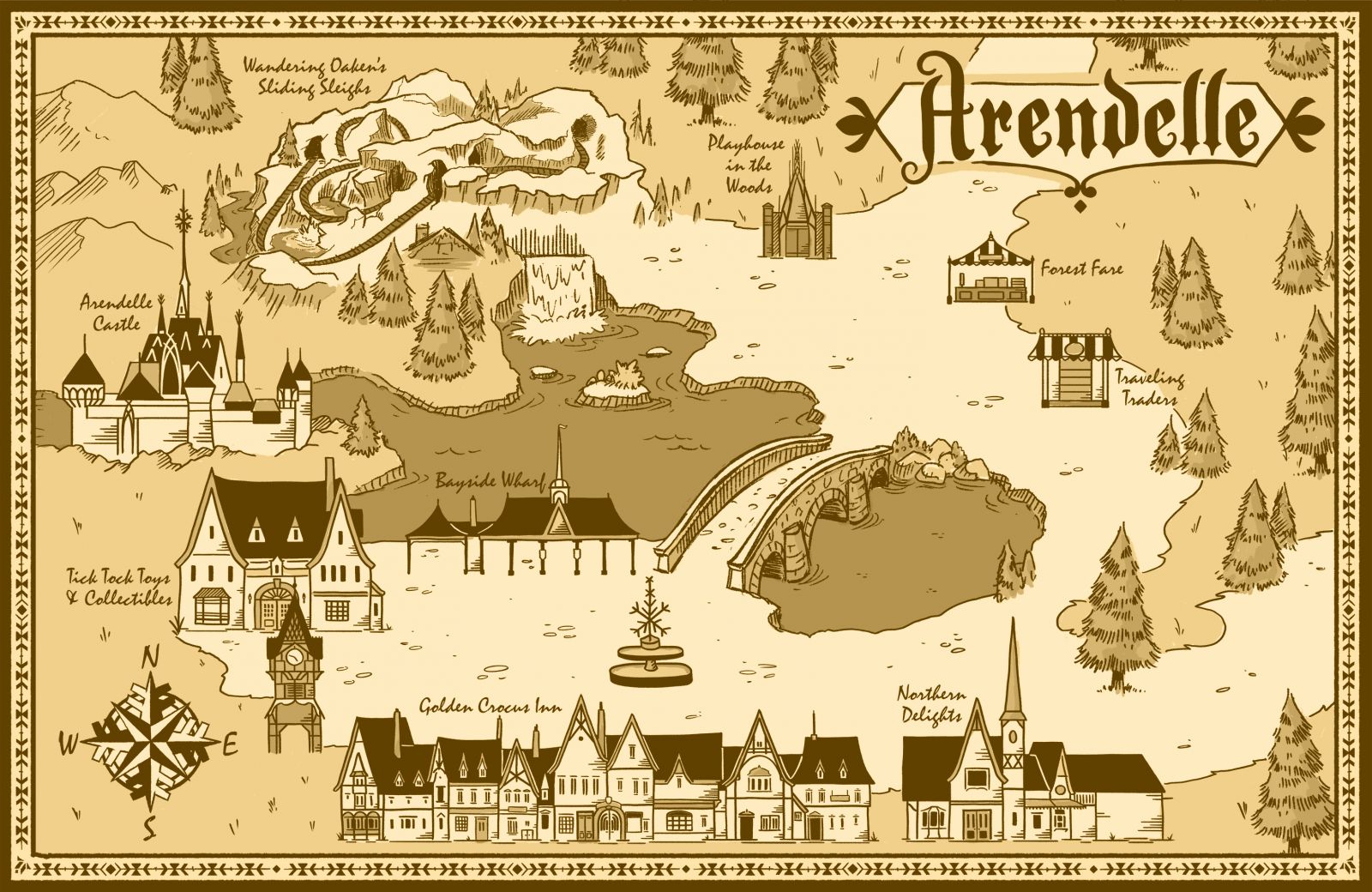 賓客可經過國王橋跨越峽灣,從阿德爾小鎮前往阿德爾森林,橋上更有偽裝成石頭的石精靈。